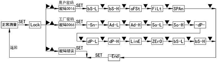 4.1按鍵功能說(shuō)明 4.1.1設(shè)定鍵“SET” ?測(cè)量模式下短按為開,進(jìn)入密碼設(shè)置。 ?設(shè)置模式菜單顯示時(shí),短按為使能參數(shù)修改,顯示當(dāng)前菜單對(duì)應(yīng)參數(shù)值,再次短按確認(rèn)參數(shù)修改,返回菜單顯示狀態(tài)。 4.1.2移位鍵“?” ?測(cè)量模式下短按無(wú)功能。 ?測(cè)量模式下長(zhǎng)按5秒執(zhí)行主變量清零功能。 ?設(shè)置模式下為移位與減一功能。 4.1.3增加鍵“▲” ?測(cè)量模式下短按與長(zhǎng)按無(wú)功能。 ?設(shè)置模式下為加一功能。 ?ADC采集菜單下短按為采集使能。 4.1.4按鍵功能綜述 儀表通過(guò)面板的三個(gè)按鍵實(shí)現(xiàn)所有的參數(shù)輸入和校準(zhǔn)數(shù)據(jù)的設(shè)置、采集,本儀表的設(shè)置和輸入采取了多種優(yōu)化措施來(lái)提高客戶的操作速度: ?儀表的移位鍵和增加鍵具有變速率功能。 ?儀表同時(shí)具有移位和增量輸入方法,針對(duì)需要大量數(shù)修改的菜單使用移位方式,需要連續(xù)輸入數(shù)據(jù)的菜單采取了增量方式。 ?儀表在設(shè)置狀態(tài)下會(huì)停止模擬輸出,在用戶設(shè)置模式下如果30秒內(nèi)用戶沒有操作儀表,則會(huì)自動(dòng)退出到測(cè)量狀態(tài)。 ?儀表在正常退出菜單的時(shí)候才會(huì)保存所有設(shè)置的參數(shù)。 4.2主變量清零 ?主變量清零即PV清零,是相對(duì)大氣壓下的零點(diǎn),不是傳感器量程的零點(diǎn)。將變送器直接置于大氣壓下,長(zhǎng)按“?”鍵5秒以上,即可進(jìn)入主變量清零功能。 ?若變送器已經(jīng)執(zhí)行過(guò)清零操作,再此執(zhí)行清零操作時(shí)將恢復(fù)未清零狀態(tài),如需重新清零則需要再執(zhí)行一次清零操作。 ?清零范圍為變送量程的25%,超出此范圍時(shí)將不執(zhí)行清零功能。 4.3設(shè)置框圖